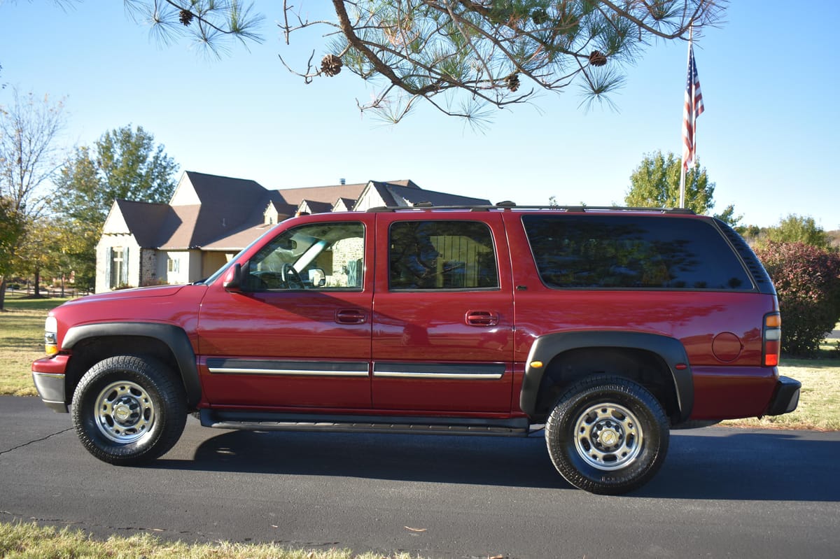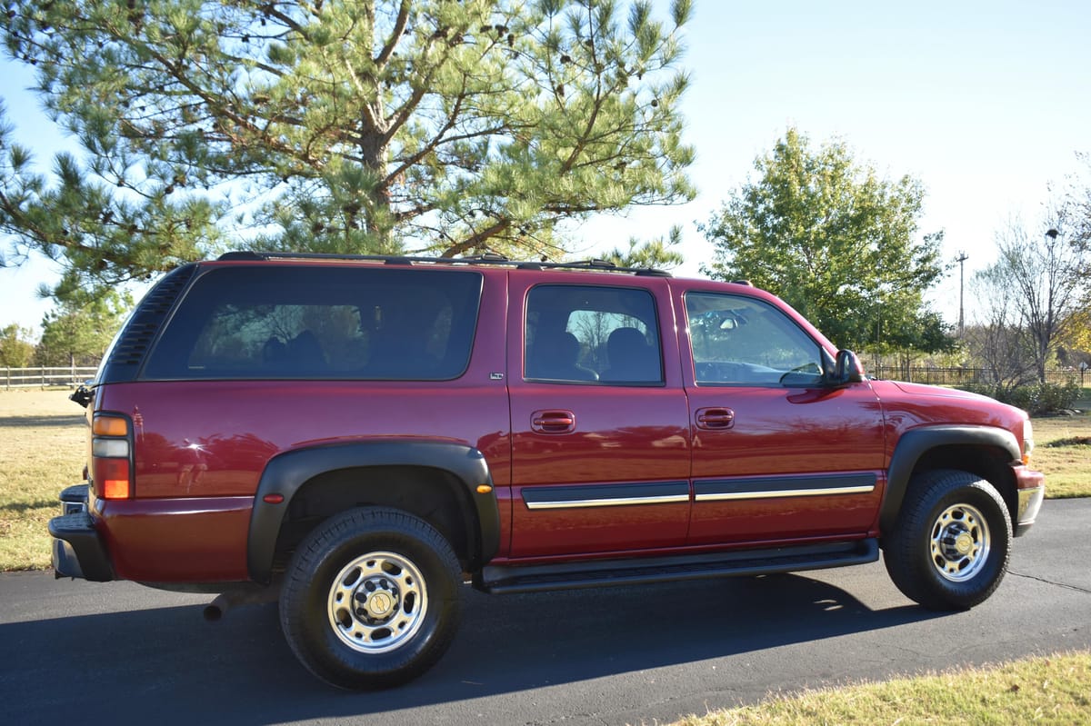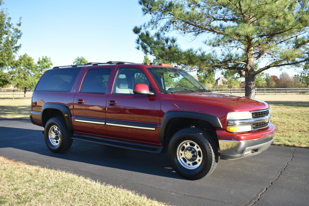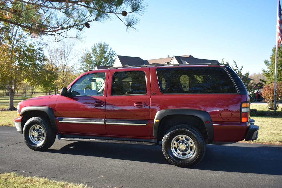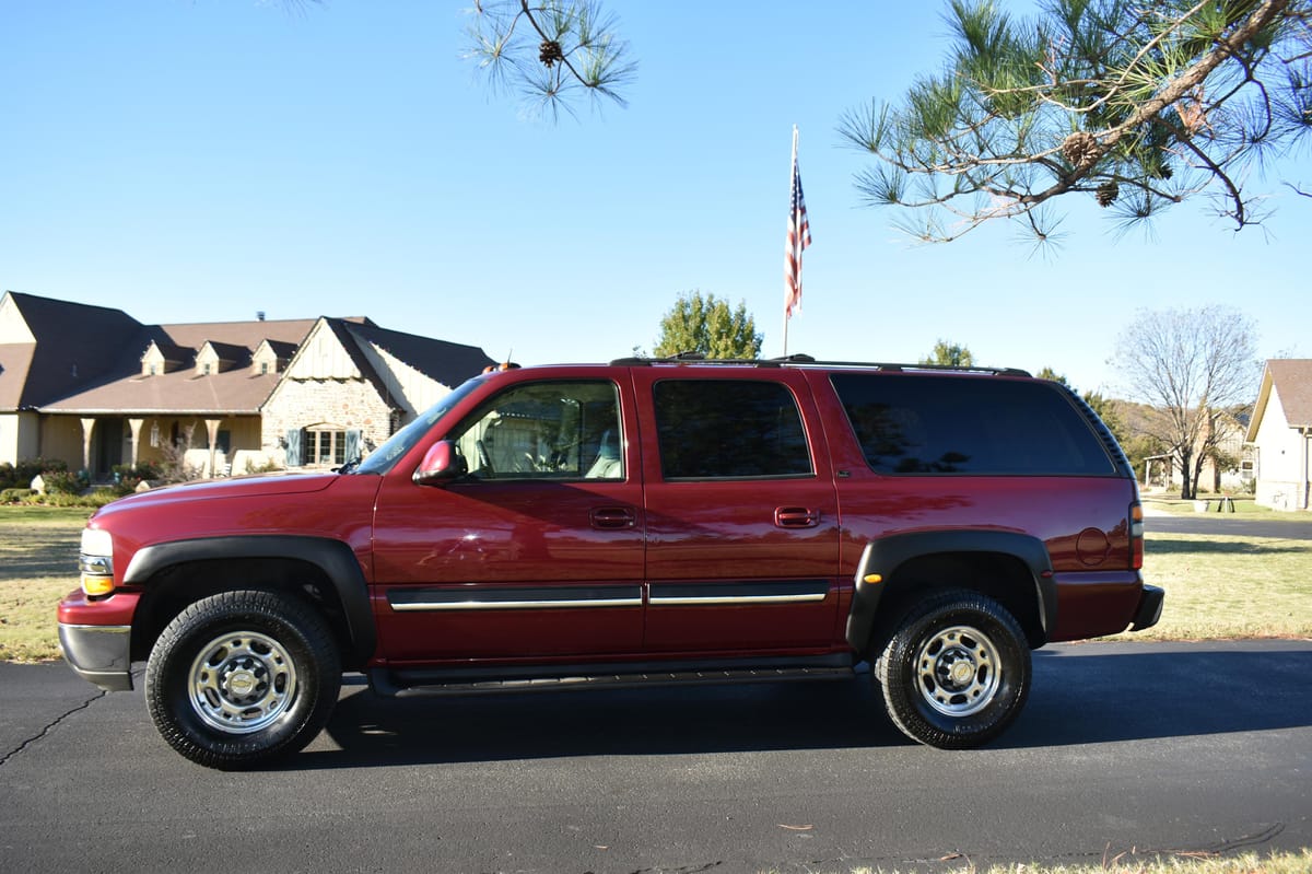 THIS… is a 2004 Chevrolet Suburban 2500 LT 4×4, finished in Sport Red Metallic with a Shale and Dark Pewter interior.