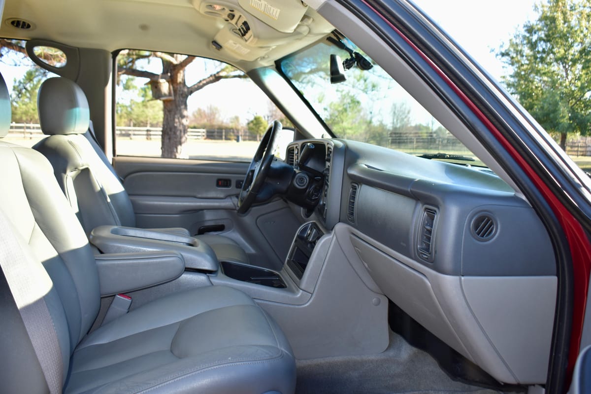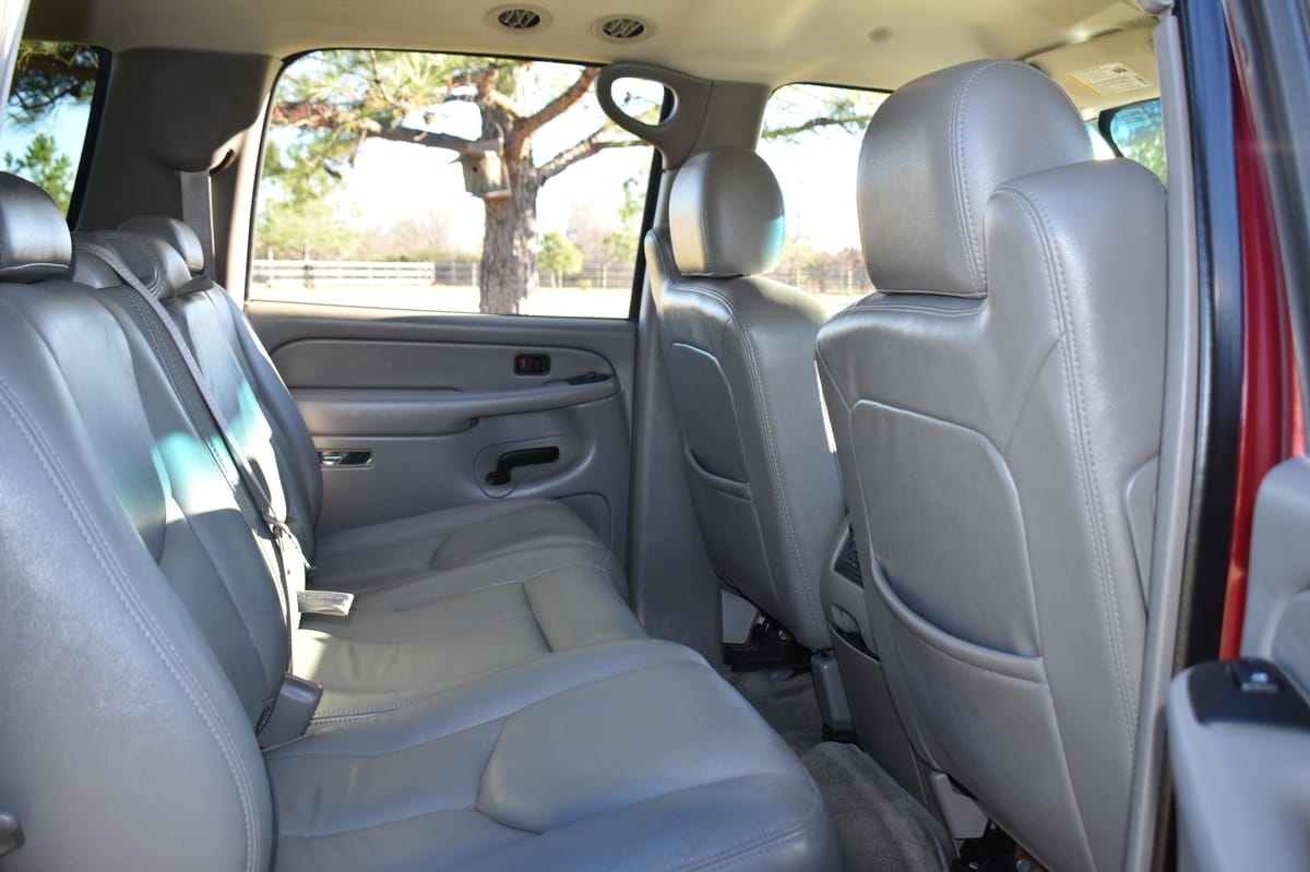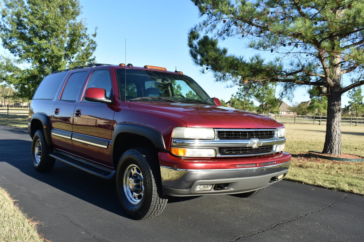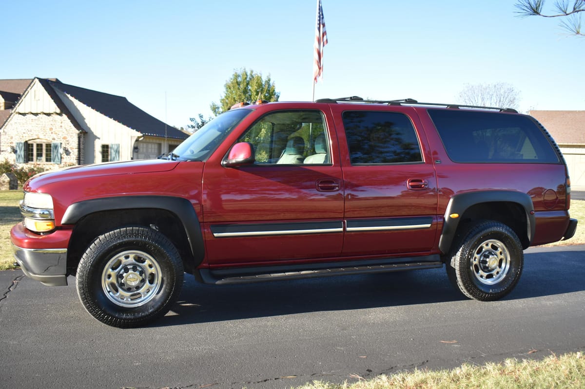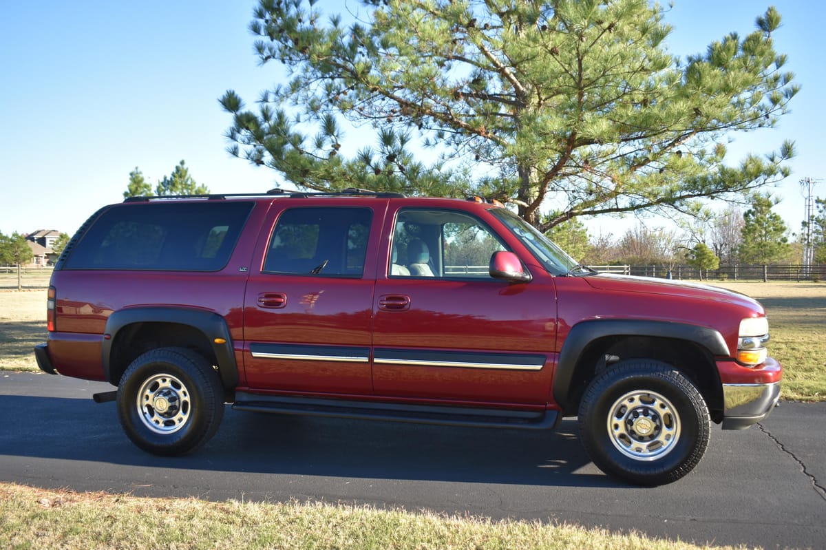 THIS… is a 2004 Chevrolet Suburban 2500 LT 4×4, finished in Sport Red Metallic with a Shale and Dark Pewter interior.