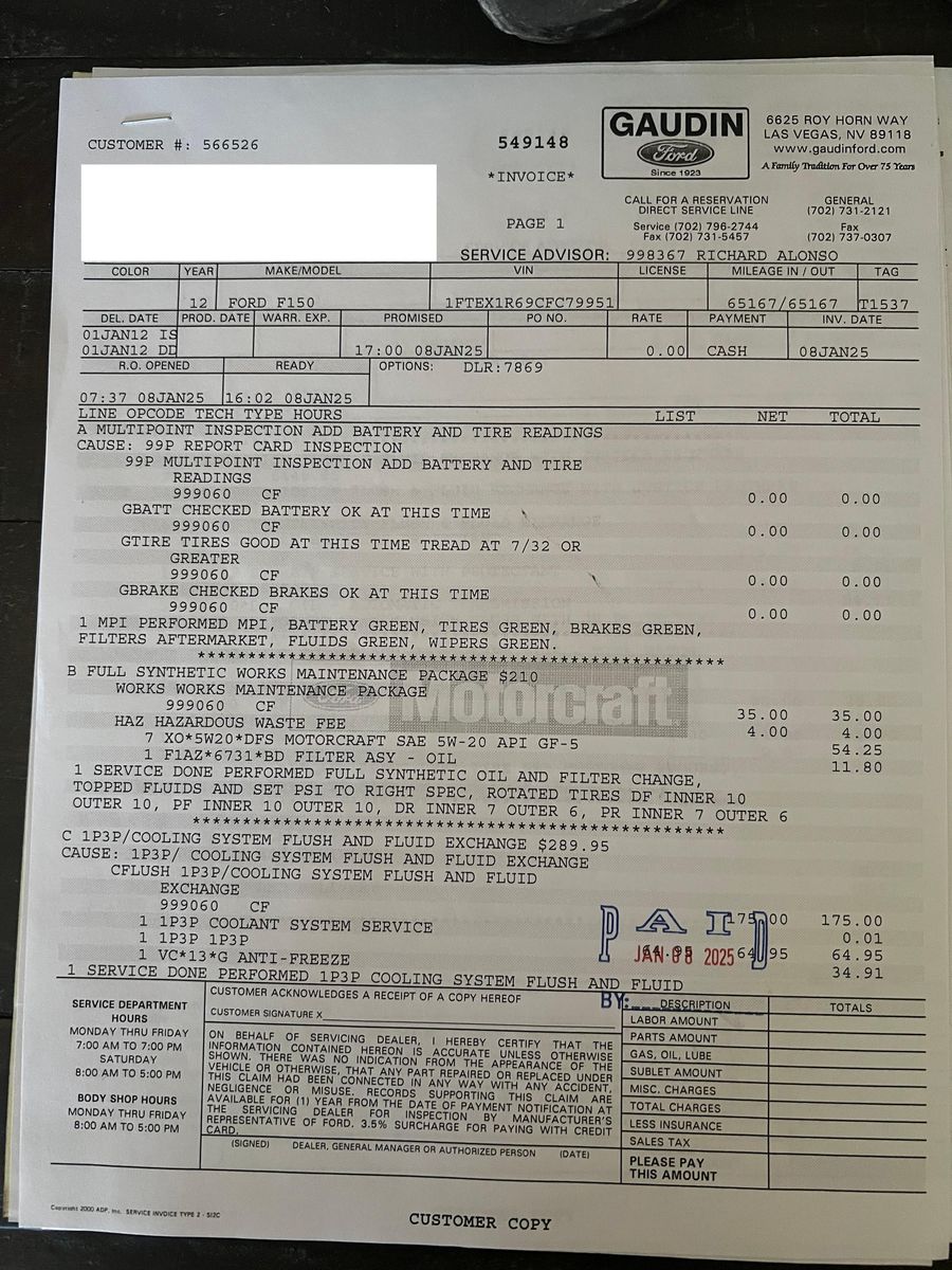 January 2025 (65,167 miles): Engine oil and filter changed, cooling system flushed
