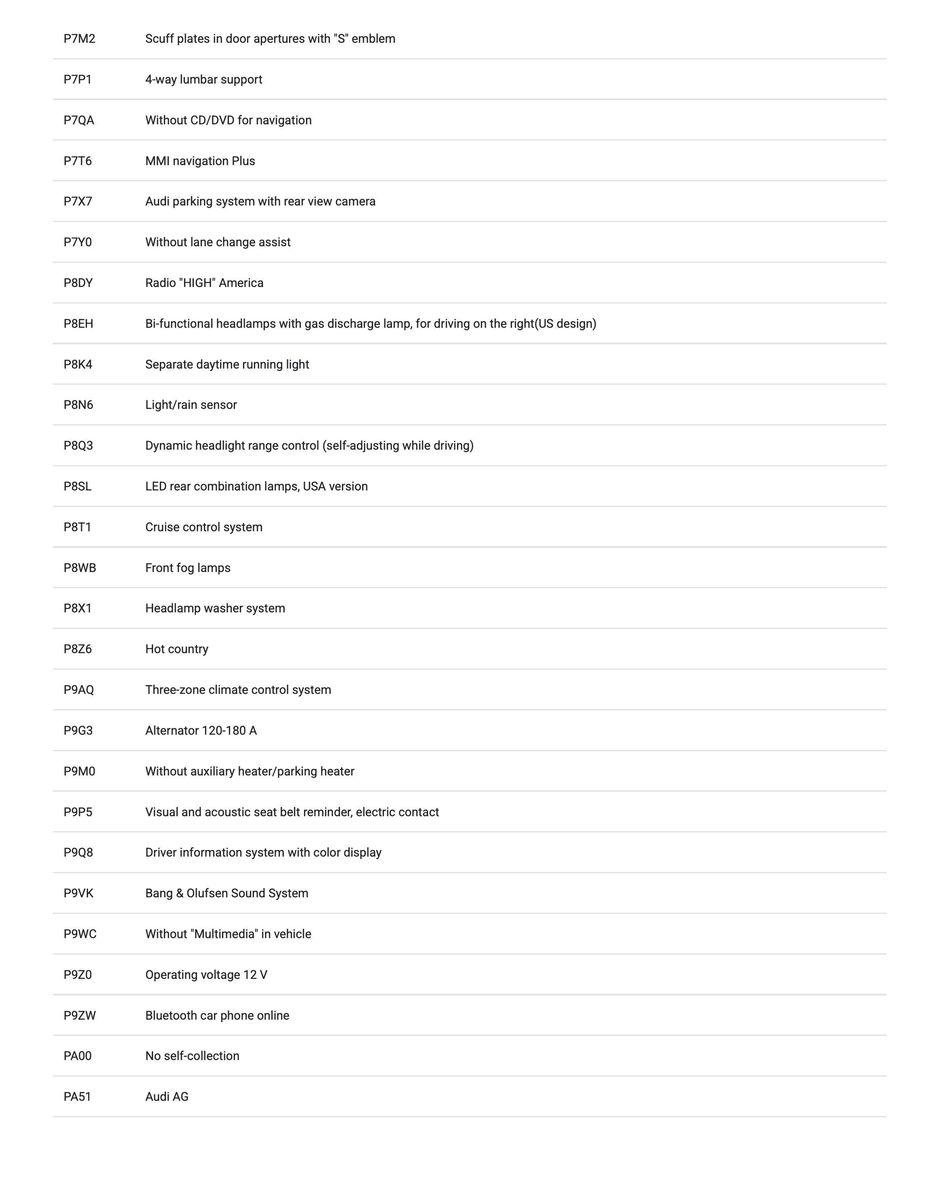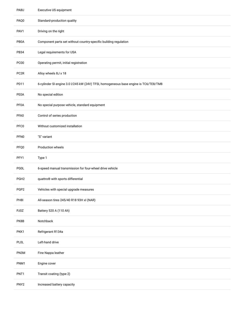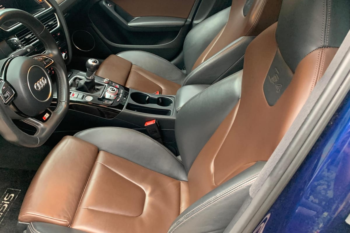 According to the build sheet provided in the gallery, notable factory equipment includes a sports differential, bi-functional headlights with Dynamic Headlight Range Control, heated front sport seats, a 3-spoke flat-bottom steering wheel, a Bang & Olufsen sound system, a MMI Navigation Plus system, and a Comfort Key.