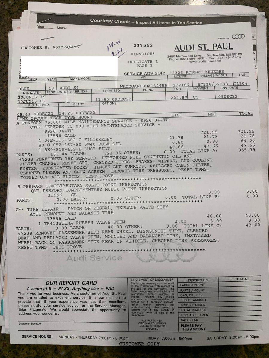 December 2022 (67,236 miles): 75,000-mile service performed, cabin air filter and 1 tire valve stem replaced, engine oil and filter changed, doors, hinges, and sunroof lubricated